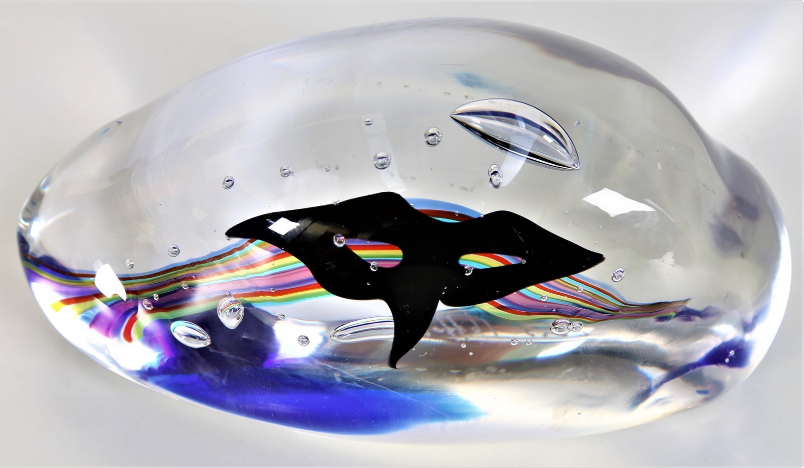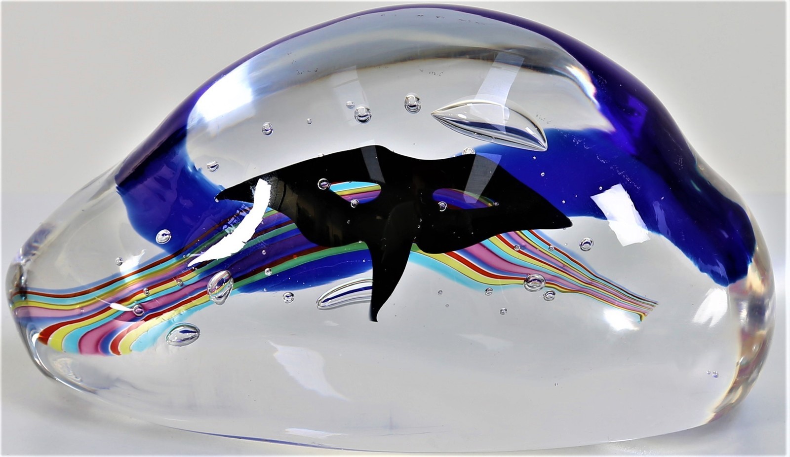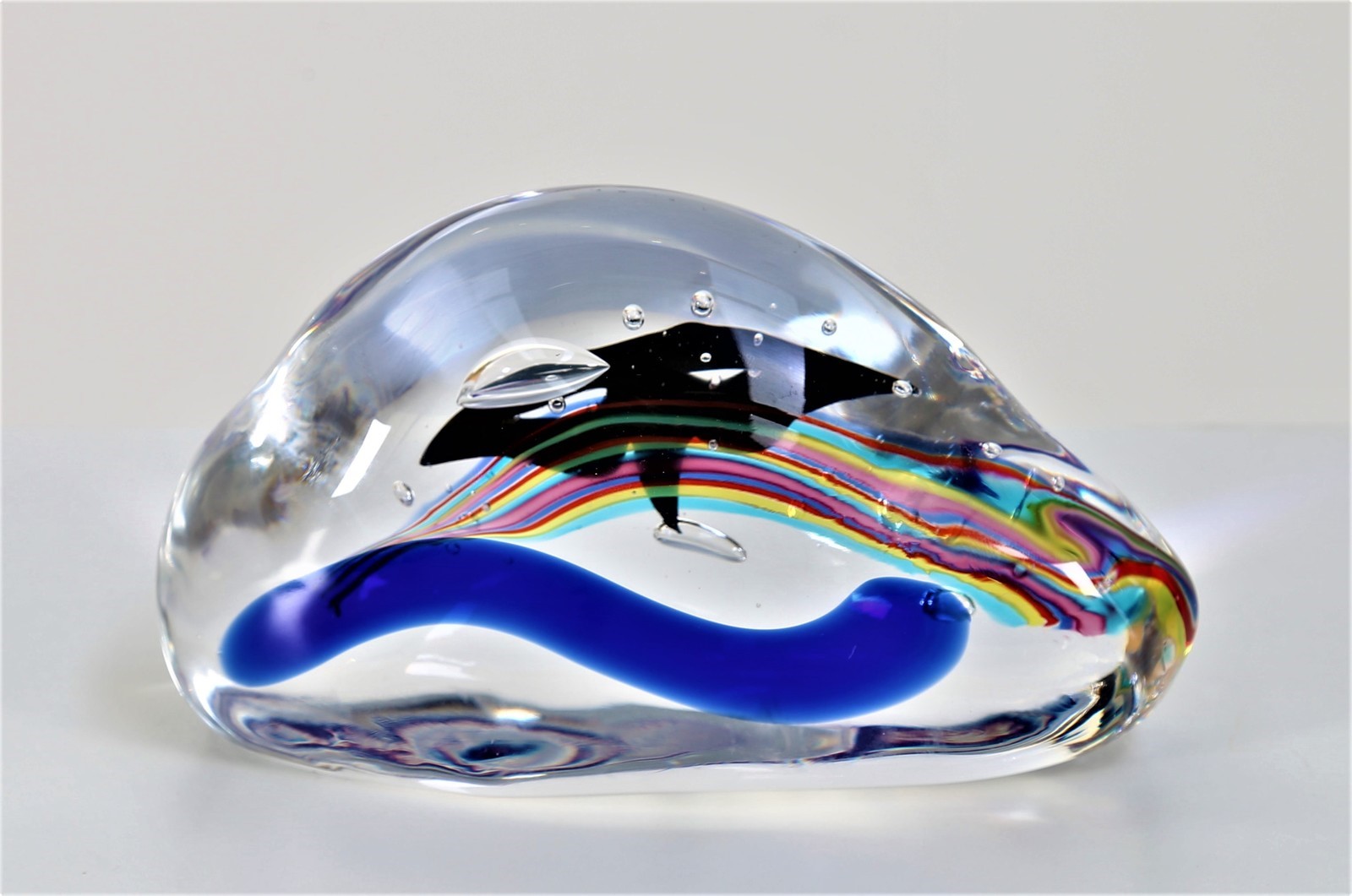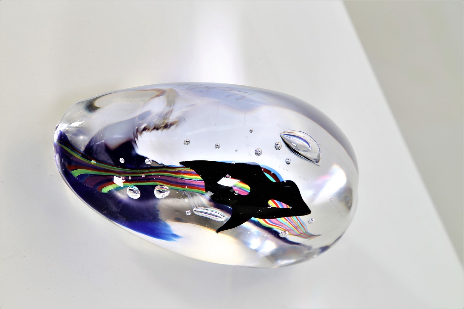 RAFFAELI ELIO Paperweight. Murano glass. Cm 17,00 x 9,50. Stone in transparent solid glass with colored inclusions, 70s.