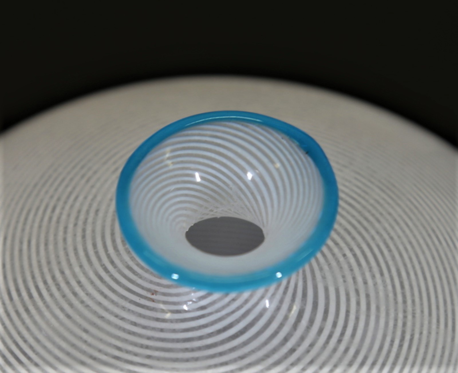 BAROVIER & TOSO Vaso. Vetro di Murano. Cm 13,00 x 11,00. Vaso in vetro a mezza filigrana con bordo in pasta vitrea azzurra, anni 60