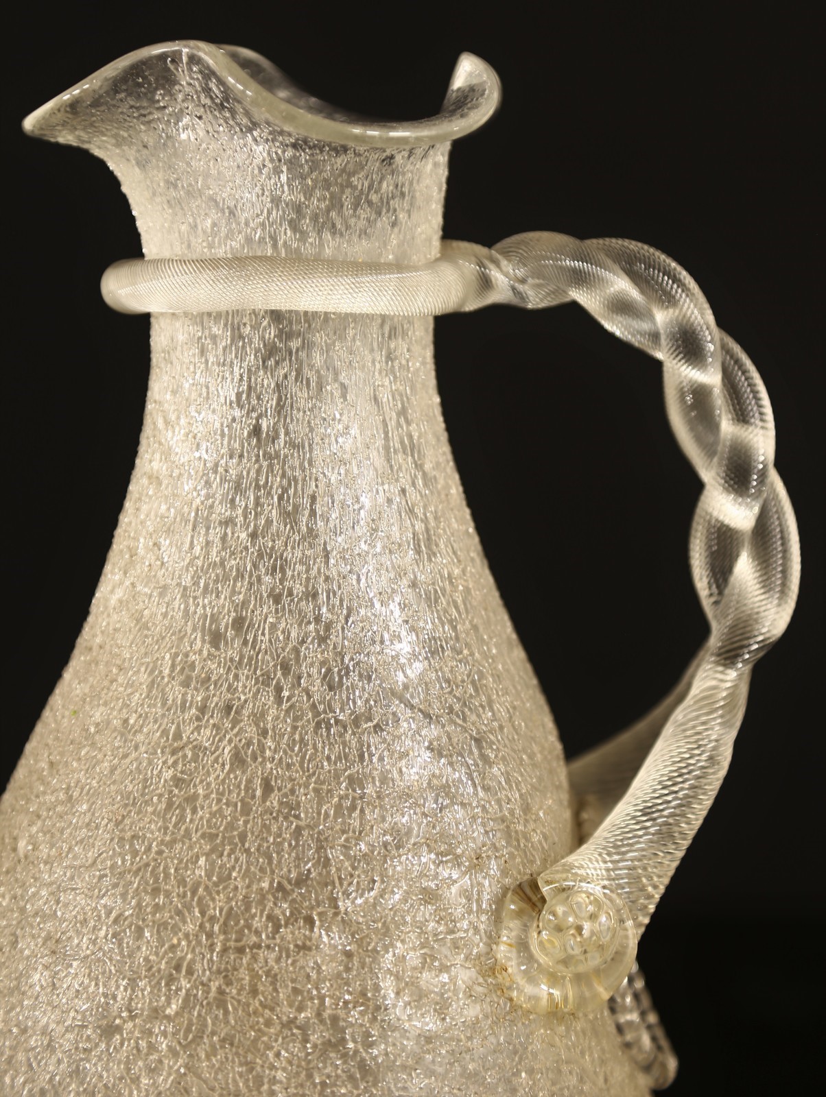 MANIFATTURA AUSTRIACA Jug. Glass. Cm 16,00 x 28,00 x 14,00. Ice-effect glass pitcher with twisted rigadin handle. Cavity for ice insertion