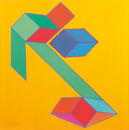 ACHILLE PERILLI Roma 28/01/1927 Grand oiseau fou, 2000 tecnica mista su tela cm. 50x50, firma e anno in basso a sinistra, firma, titolo e anno al retro, dichiarazione d'autenticità dell'artista su foto, entro teca in plexiglass.