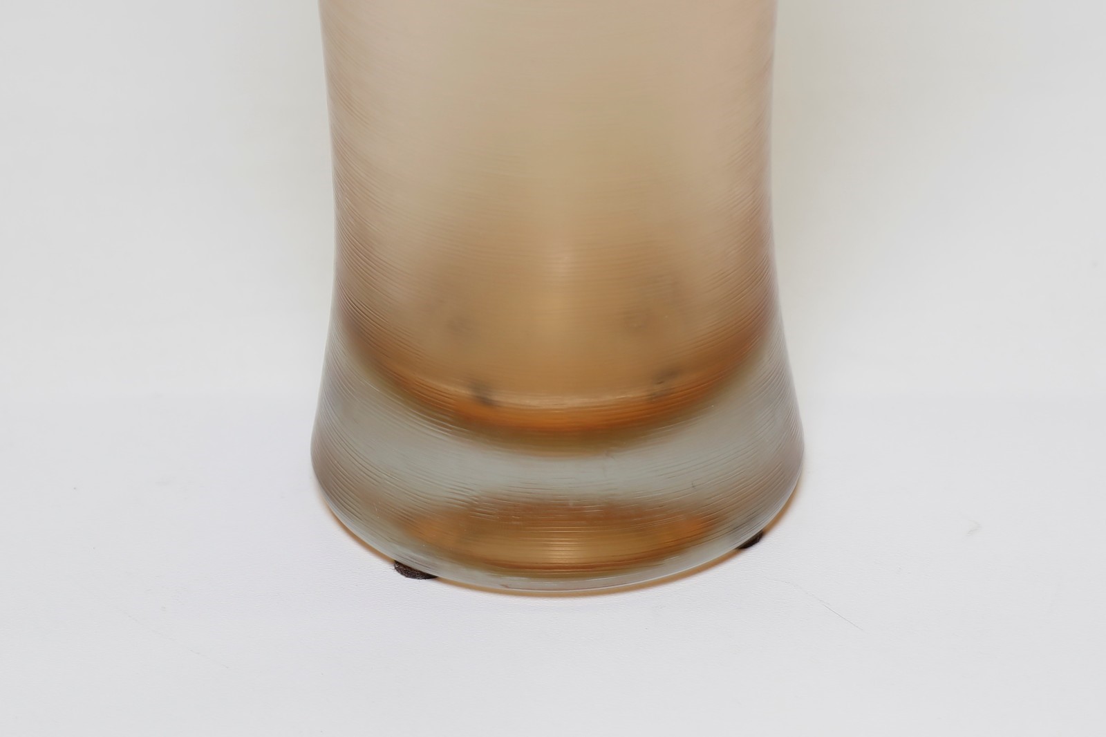 VENINI PAOLO (1895 - 1959) Vaso. Vetro di Murano. Cm 9,50 x 29,00. Vetro pesante corniola a colori sovrapposti, rifinito da leggere incisioni orizzontali su tutta la superficie, 1956. Firmato Venini Murano Made in Italy.