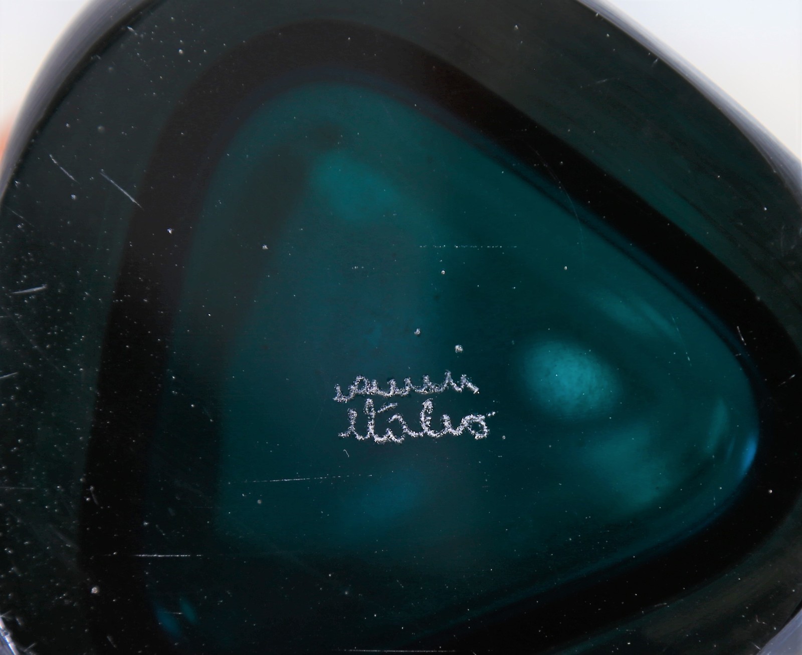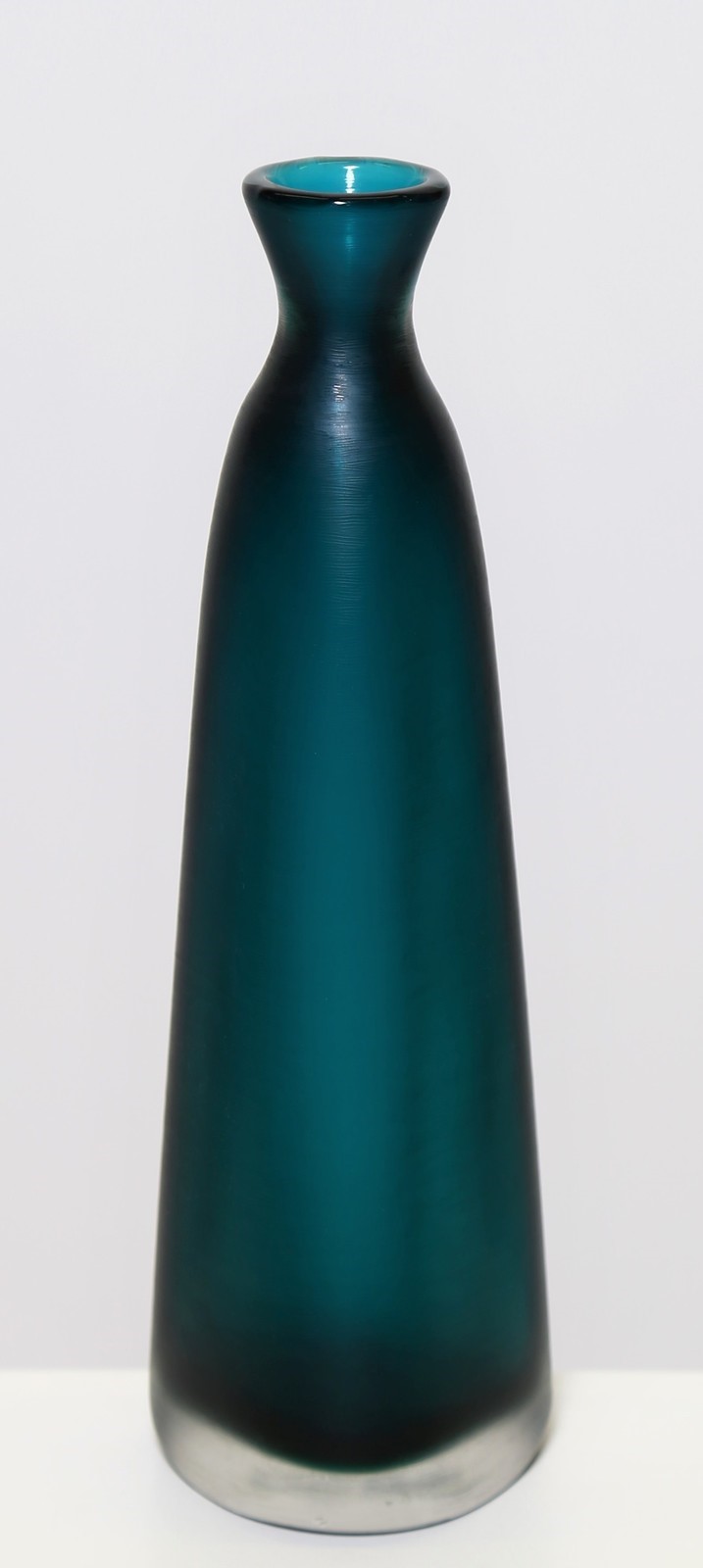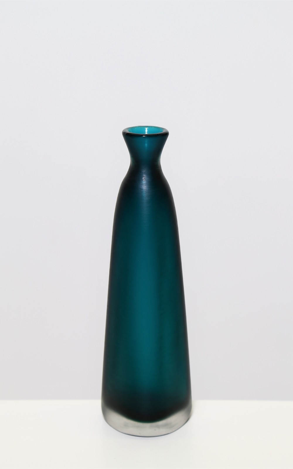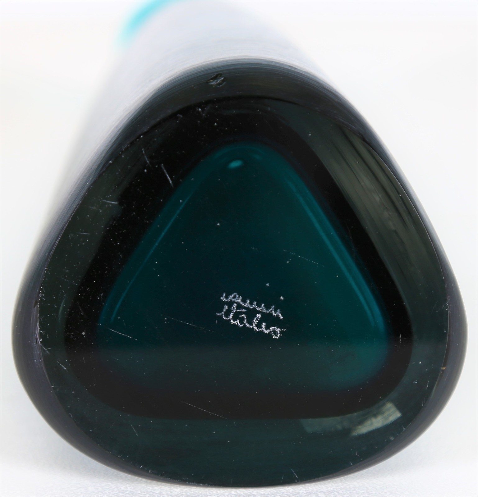 VENINI PAOLO (1895 - 1959) Bottiglia. Vetro di Murano. Cm 9,00 x 29,50 x 9,00. Bottiglia in vetro di Murano inciso color verde intenso, firma a graffio "Venini, Italia". Per Venini Murano, anni 60.