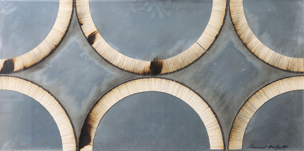 BERNARD AUBERTIN Fontenay aux Roses 1934 Dessin de feu fiammiferi bruciati applicati su alluminio cm. 50x100, firma in basso a destra, etichetta del Civico Museo Parisi (Valle Maccagno-VA) al retro, dichiarazione d'autenticità dell'artista su foto, pubblicato sul catalogo della mostra "Bernard Aubertin, Fuoco e metallo", tenutasi presso la Galleria Allegrini Arte, pagina 174, pubblicato sul catalogo della mostra "Bernard Aubertin, Territori di fuoco", tenutasi presso il Civico Museo Parisi (Valle Maccagno-VA) dal 15 maggio al 13 luglio 2011, pagina 54, entro teca in plexiglass con piccola filatura in basso a sinistra.