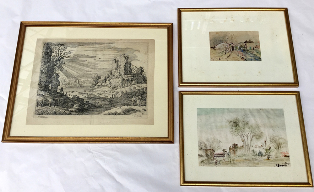 Lotto composto da un'antica incisione e due tecniche miste raffiguranti paesaggi, firmate Graziotti, in cornici (difetti)