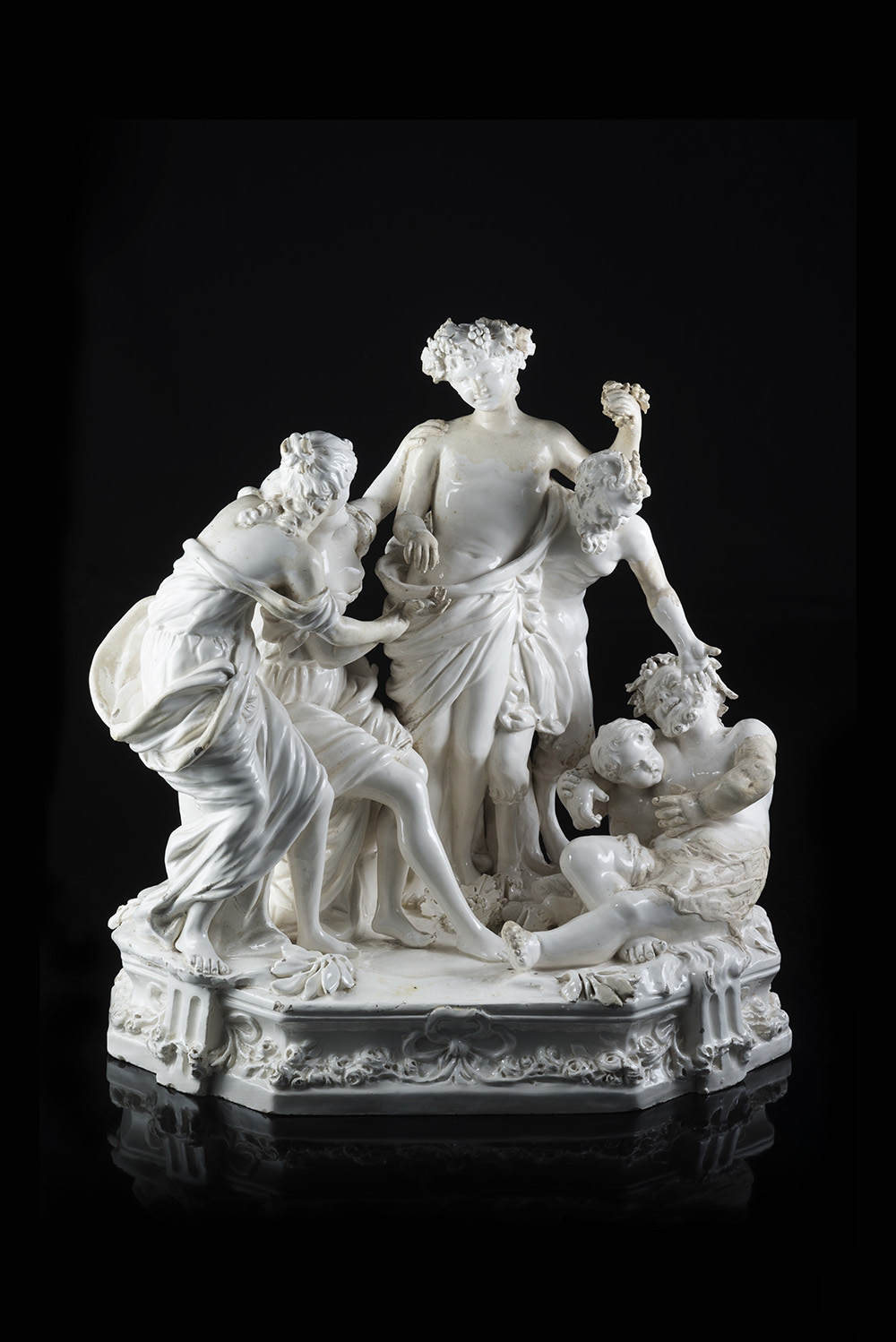 Manifattura italiana, secolo XIX. Gruppo in terraglia con scena bacchica (h. cm 41) Marchio "M coronata" inciso alla base (difetti e restauri)