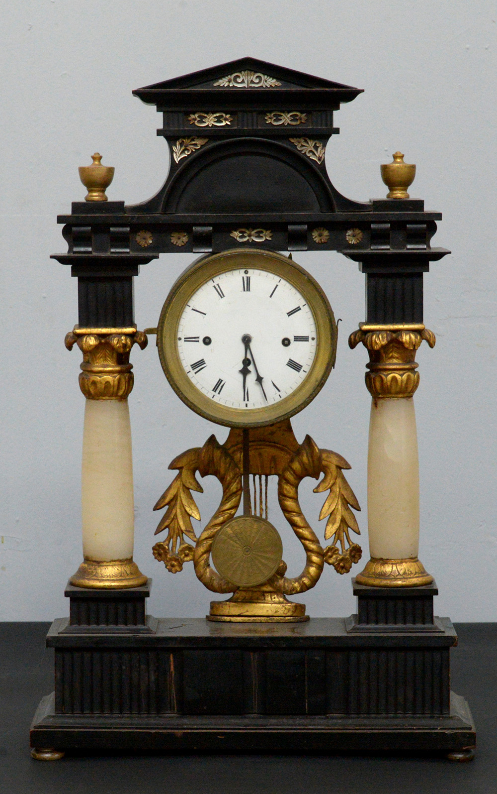 Pendola austriaca da tavolo a portico in ebano con inserti in madreperla con colonnine in alabastro. Quadrante smaltato a numeri romani, carica manuale con suoneria su gong di ore e quarti. Epoca metà sec. XIX (cm 40 x 62 x 13) (difetti)