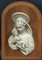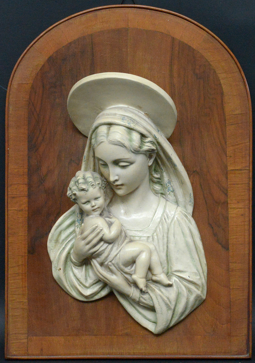 "Madonna con Bambino", scultura in ceramica dipinta su pannello ligneo centinato, firmato sul fianco (cm tot 35x50) (difetti)