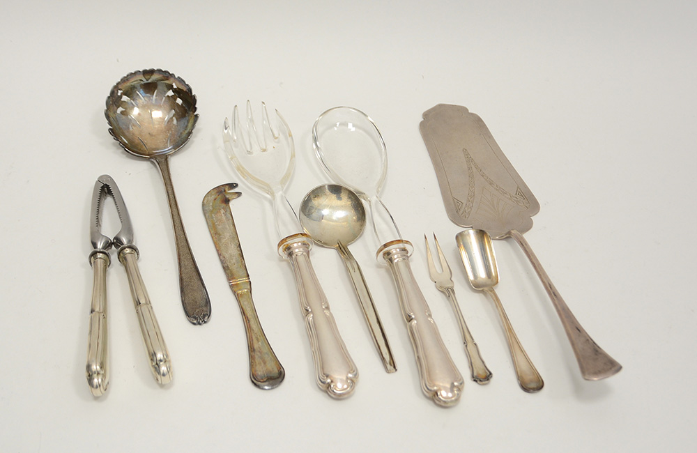 Lotto composto da sette posate ed uno schiaccianoci in argento e metallo