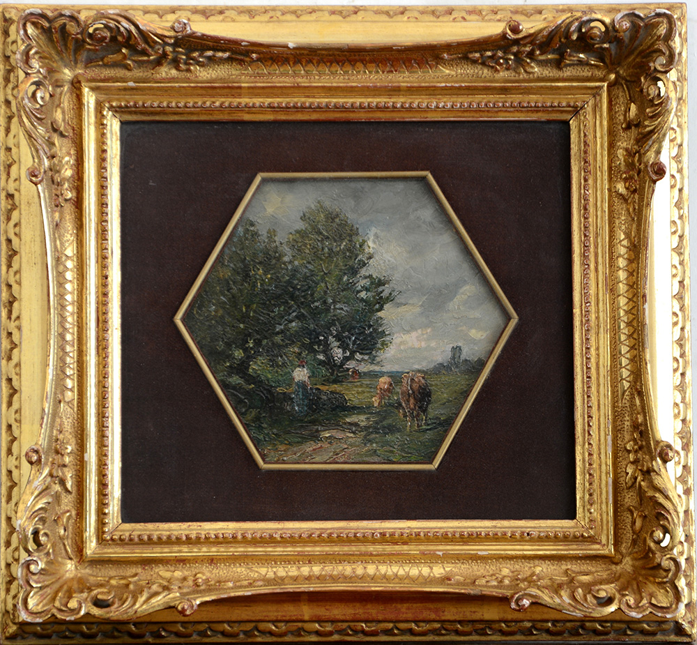 Maestro piemontese del XIX Secolo "Paesaggio con armenti" olio su ceramica a forma esagonale (cm 13.5x15) Al retro: cartiglio della Raccolta d'Arte CIE che lo attribuisce ad Antonio Fontanesi. In cornice