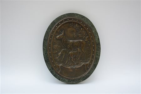 Placca ovale in bronzo decorata in rilievo con cerbiatti, montata su base in marmo verde (cm 35x28) (difetti)
