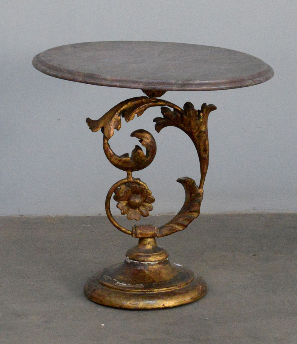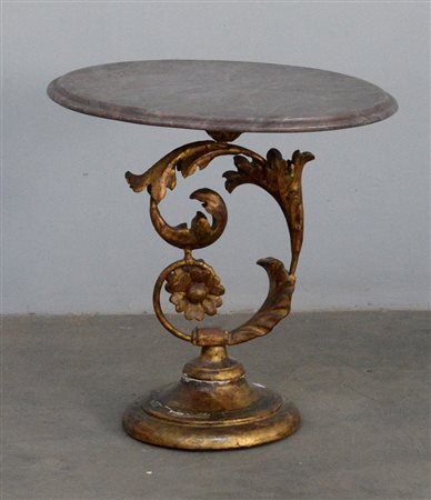 Tavolino tondo da salotto con sostegno in ferro e legno dorato intagliato a decoro fogliaceo. Piano dipinto a finto marmo (h cm 54, d cm 55) (difetti)
