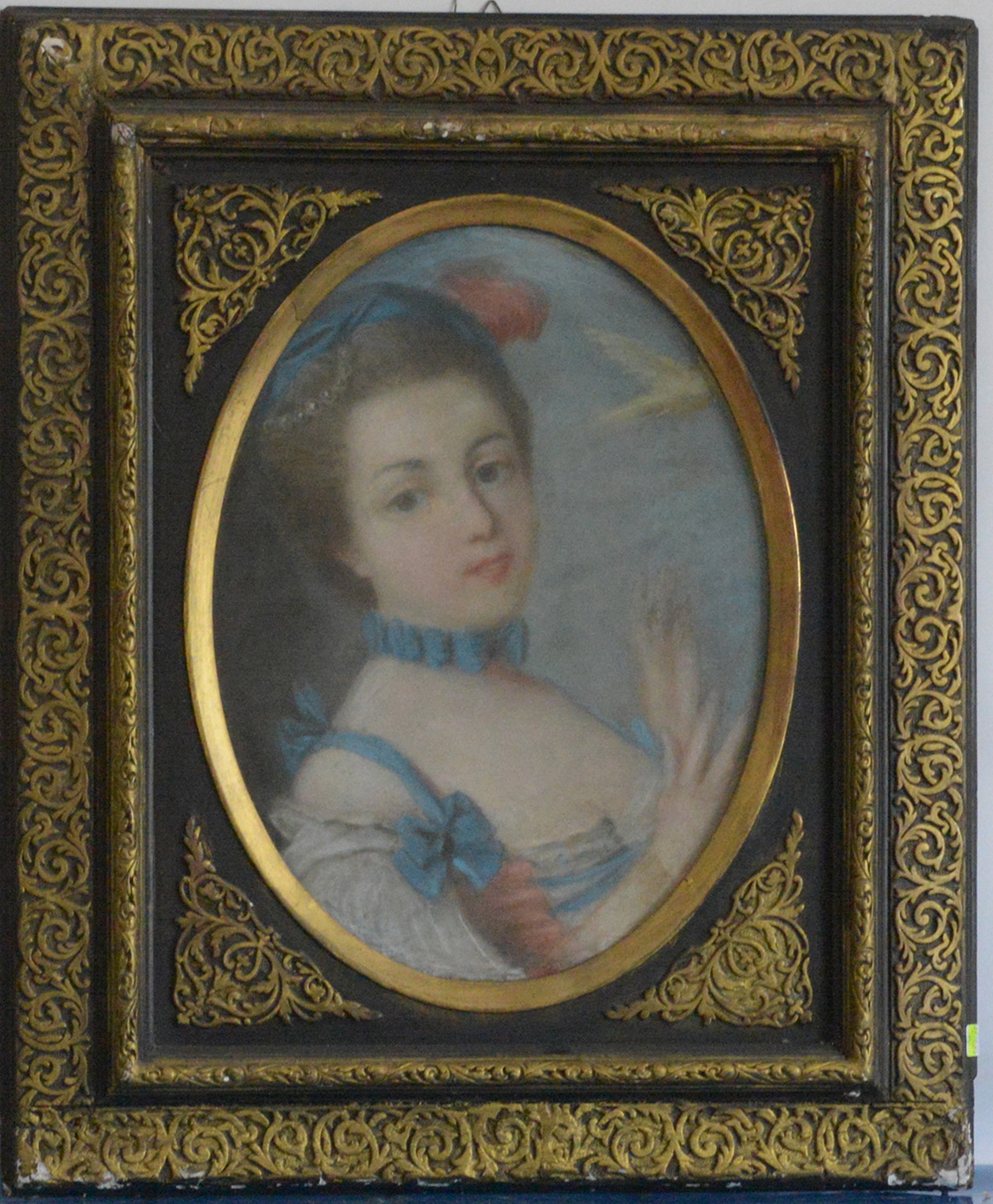 Scuola francese del secolo XIX, "Ritratto di dama" pastelli colorati su cartoncino ovale (cm 42,5x33). In cornice (difetti)