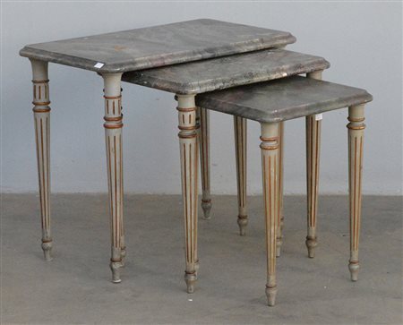 Tre tavolini da salotto in legno laccato con gambe rastremate e piani dipinti a finto marmo (difetti)