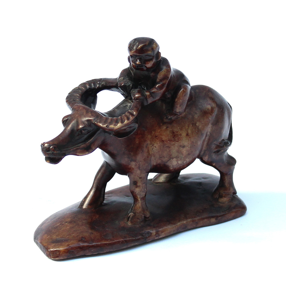 Scultura in pietra dura raffigurante fanciullo su bufalo. Cina, sec. XX (h cm 9) (difetti)