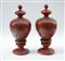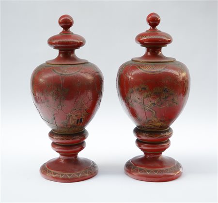 Coppia di elementi decorativi in legno laccato a fondo rosso e decorato a paesaggi e fregi dorati (h cm 45)(difetti)