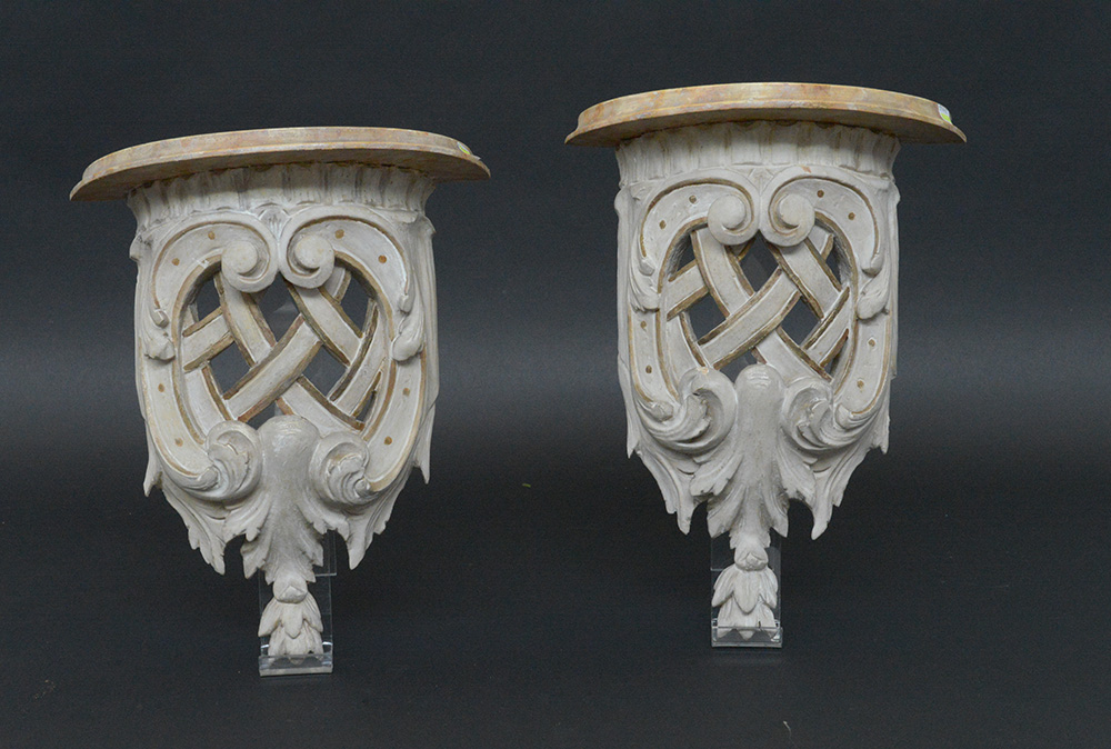 Coppia di mensoline in legno intagliato e laccato con piani dipinti a finto marmo (cm 30x35x14) (lievi difetti)