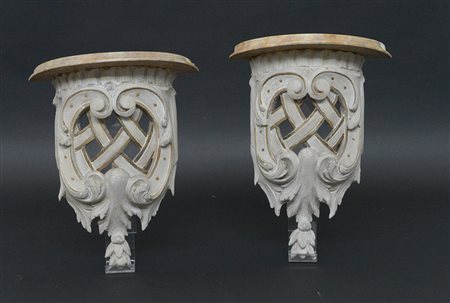 Coppia di mensoline in legno intagliato e laccato con piani dipinti a finto...