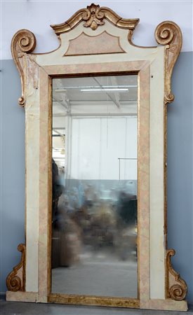 Caminiera di forma architettonica in legno intagliato, laccato e dorato (cm 250x150) (gravi difetti)