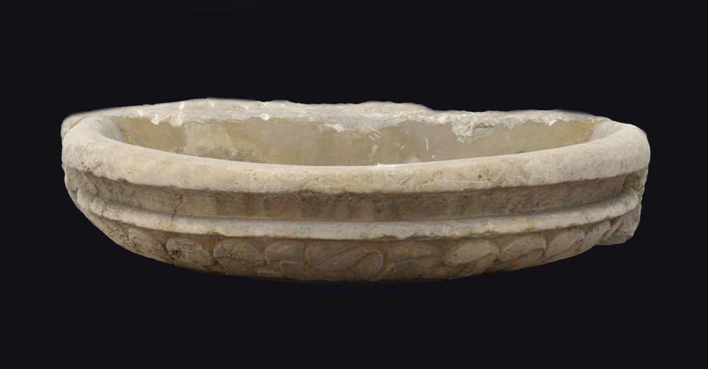 Antica vasca da fontanella in marmo a forma di mezzaluna con bordo a sagoma e scolpito a fregi (cm 96x20x66) (difetti)
