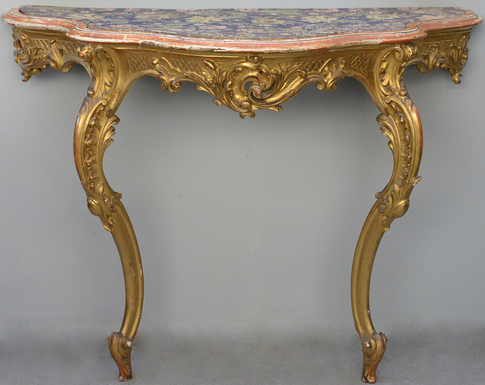 Antica console di forma sagomata in legno intagliato e dorato a motivi...