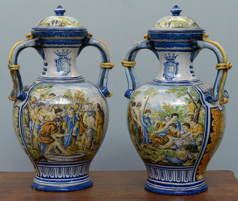 Manifattura della fine del secolo XIX, coppia di vasi con coperchio biansati in maiolica decorati con scene bibliche in policromia e a fregi e cartigli in blu. Anse sagomate, coperchi decorati in policromia a paesaggi (h cm 58) (difetti e restauri)
