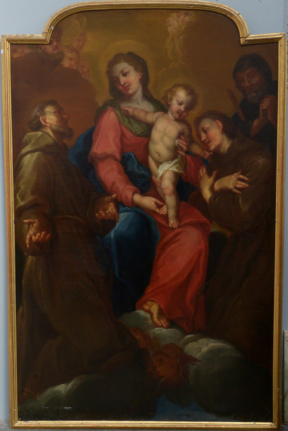 Scuola italiana del secolo XVIII "Vergine con Bambino e Santi" olio su tela sagomata (cm 191x120) (difetti e restauri)