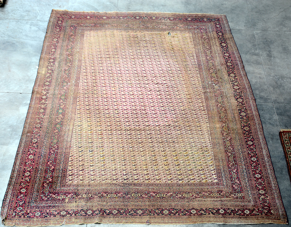 Tappeto Kohrassan, Persia fine del secolo XIX. Decoro all over con file di boteh su fondo bianco, molteplici bordure (cm 381x280)(gravi difetti)