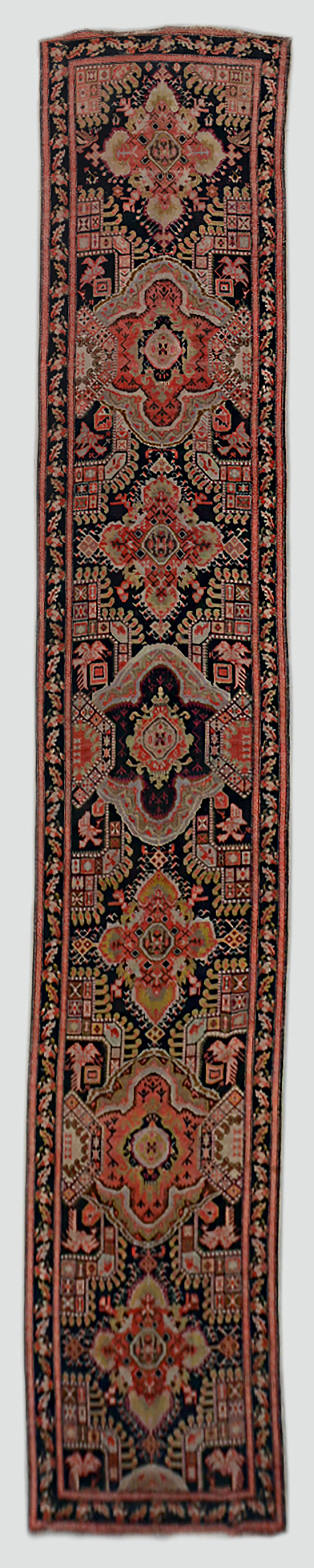 Tappeto passatoia Karabagh, Caucaso fine secolo XIX. Disegno di ispirazione francese con medaglioni nei toni del rosa, rosso, beige e noccila su fondo blu notte (cm 578x107)(difetti)