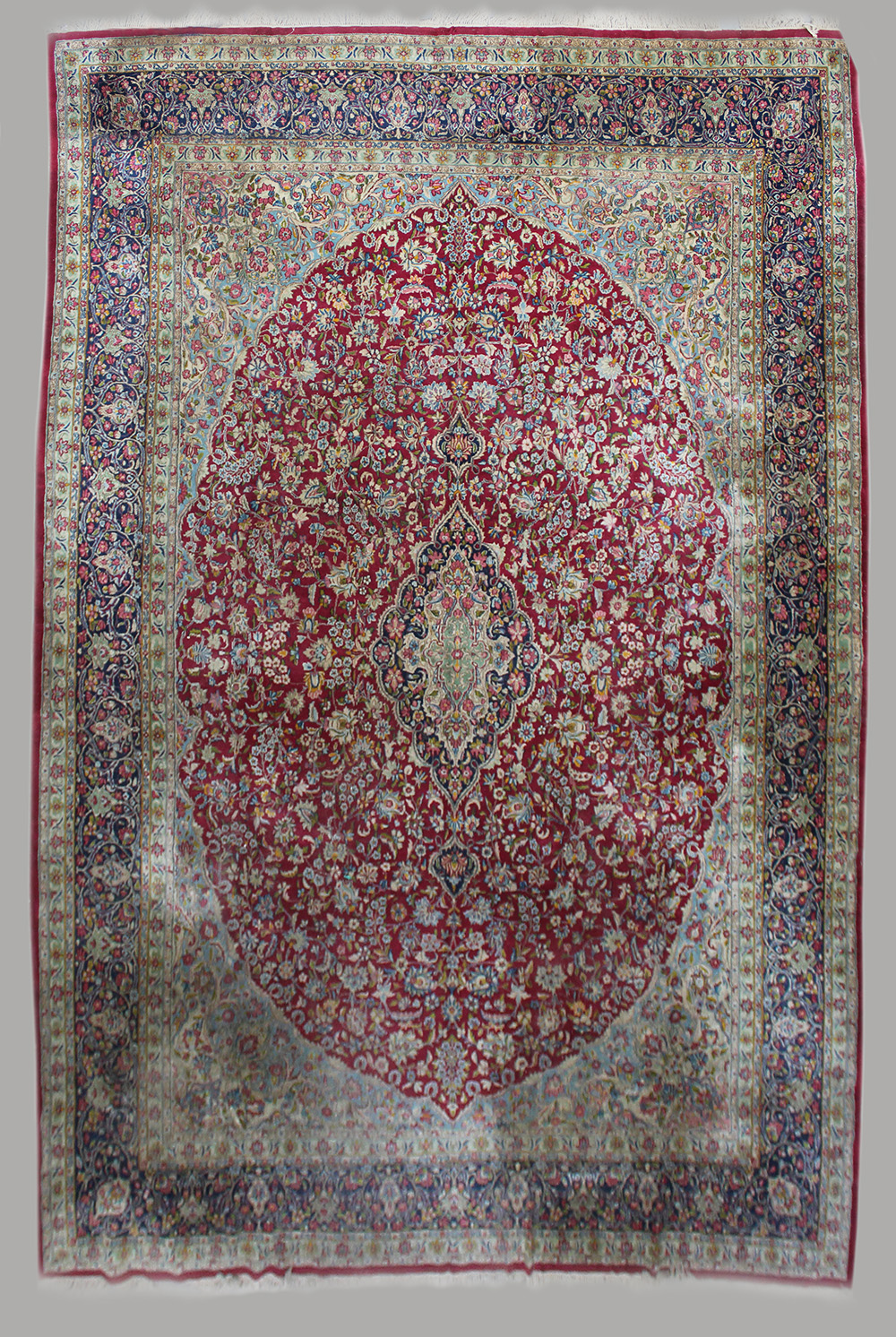 Tappeto Kirman, Persia secolo XX. Disegno a medaglione su fondo rosso, decorato con rami fioriti (cm 550x361)(difetti)