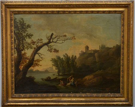 Artista del secolo XVIII “Paesaggio fluviale con lavandaie”, olio su tela (cm 74x99). In cornice antica (difetti e restauri)