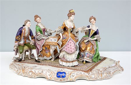 Gruppo in porcellana policroma raffigurante scena galante con concerto (largh. cm 60) Secolo XX (difetti e mancanze)