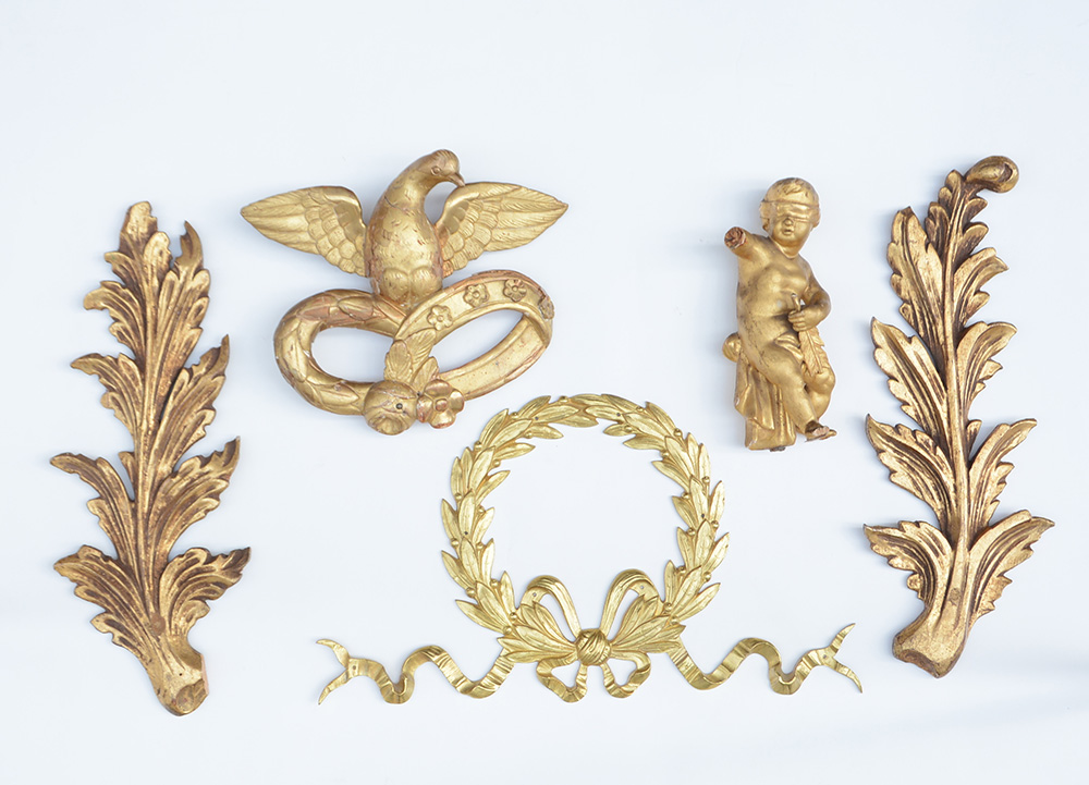 Lotto composto da cinque fregi dorati, di cui quattro in legno e una in metallo (difetti)