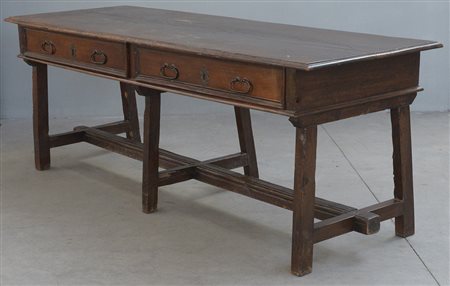 Antico tavolo a due cassetti nella fascia e gambe riunite da traversa (cm 210x80x76) (difetti e restauri)