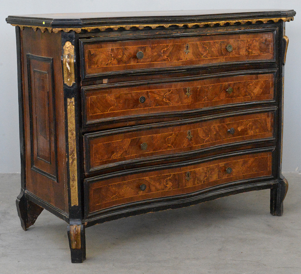 Canterano lastronato in noce con profili ebanizzati, fronte mosso con specchiature in radica filettate in legno chiaro, grembiale e montanti dorati (cm 143x110x61) Lombardia secolo XVIII (difetti e restauri)