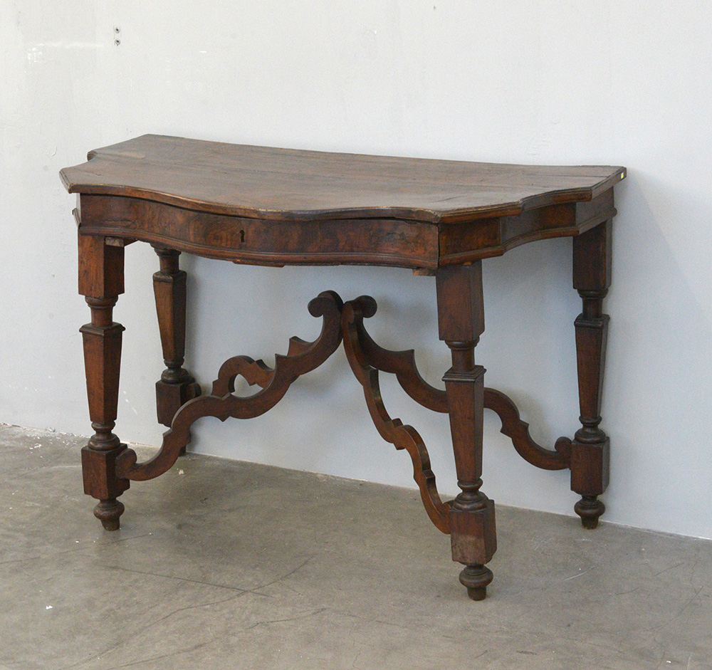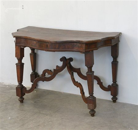 Console di forma sagomata in noce e radica di noce, gambe a balaustro con cassetto sottopiano, secolo XVIII (cm 118x60x62) (difetti)