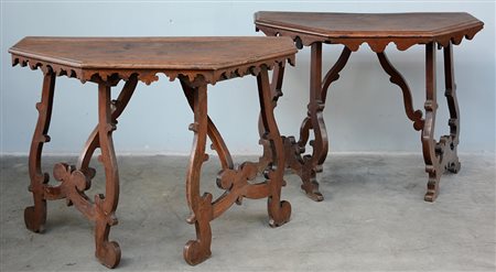 Due consolles fratine con montanti a lira riuniti da traverse. Secolo XVIII (cm 111x82x55) (difetti)