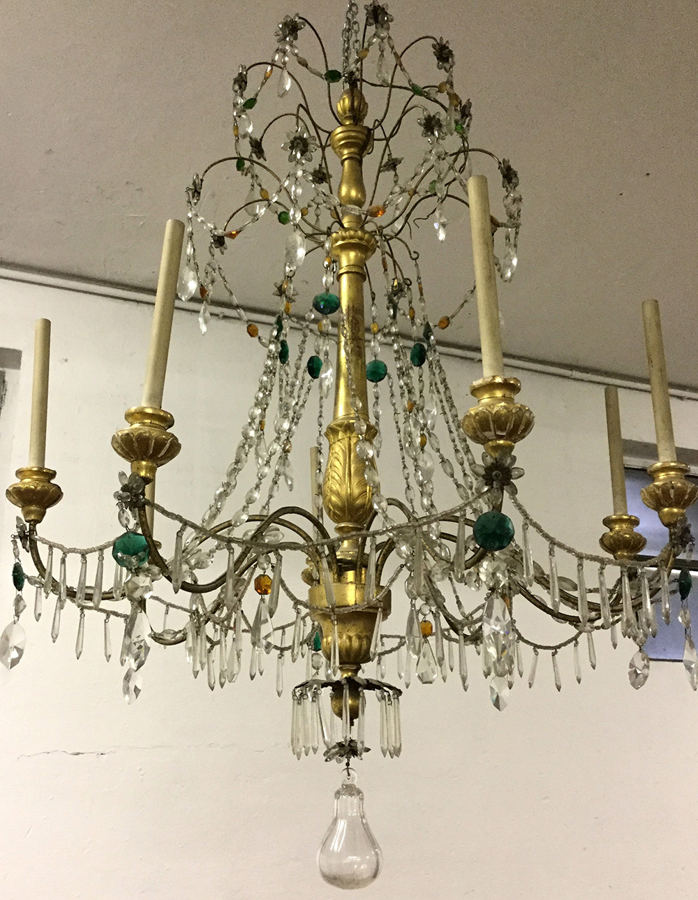Lampadario a otto luci con fusto in legno intagliato e dorato, bracci in metallo, decorato con pendagli in cristallo sfaccettato (d. cm 83x h. 130) (difetti e mancanze)