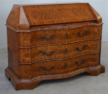 cassetti e anta ribaltabile celante vano e cassettini. Piedi a mensola. Veneto, secolo XVIII (cm 140x109x64)(difetti)
