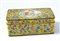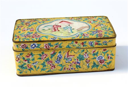 Scatola in metallo smaltato decorato con figure e motivi floreali su fondo giallo. Cina, sec. XX (l cm 21)(difetti)