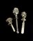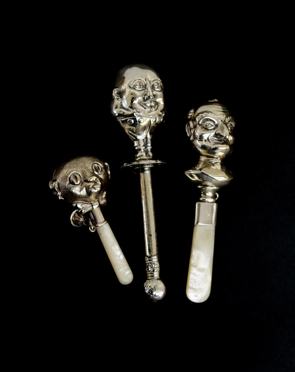 Gruppo di tre sonagli in argento figurato a volti grotteschi e animale, due con manici in madreperla (difetti)
