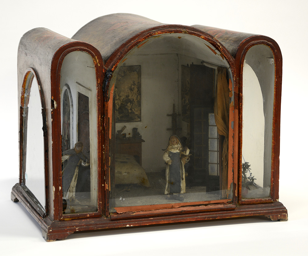 Arte napoletana, secolo XIX "Interno di convento" teca in legno laccato decorato in policromia a fiori. Interno con modelli di mobili, suppellettili, figure e incisioni (cm 46x38x33) (difetti e restauri)