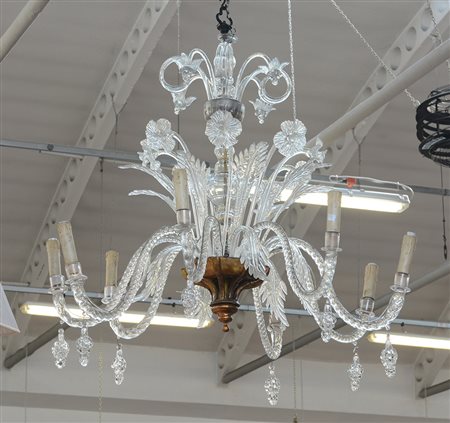 Manifattura di Murano, antico lampadario a otto braccia in vetro incolore con...