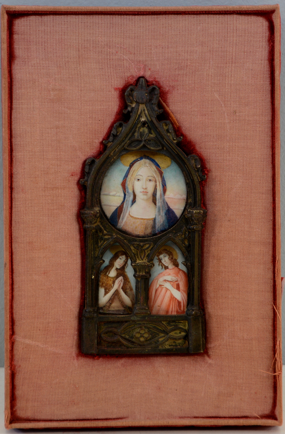 Scuola del secolo XIX "Madonna con Santi" miniatura su avorio sagomato entro cornice neogotica (cm 14x16) (difetti)