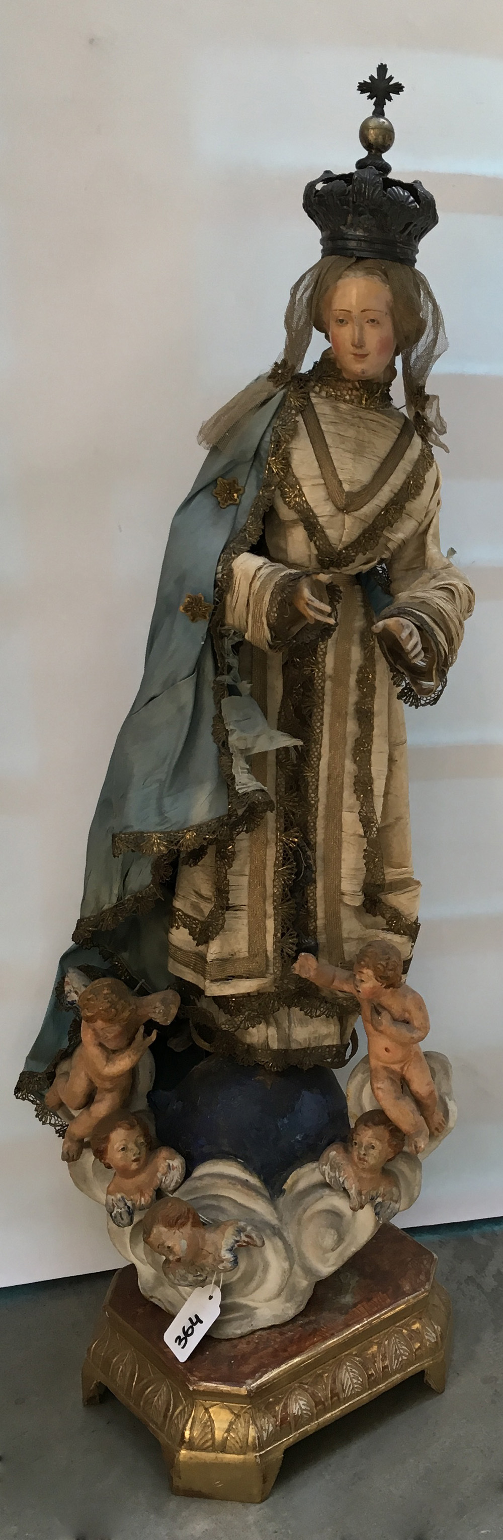 Arte napoletana, secolo XIX "Madonna dell'Apocalisse" scultura con viso e arti in terracotta, vesti in seta con accessori in argento e metallo argentato (mancanze, restauri e sostituzioni) Su base in legno dorato
