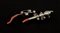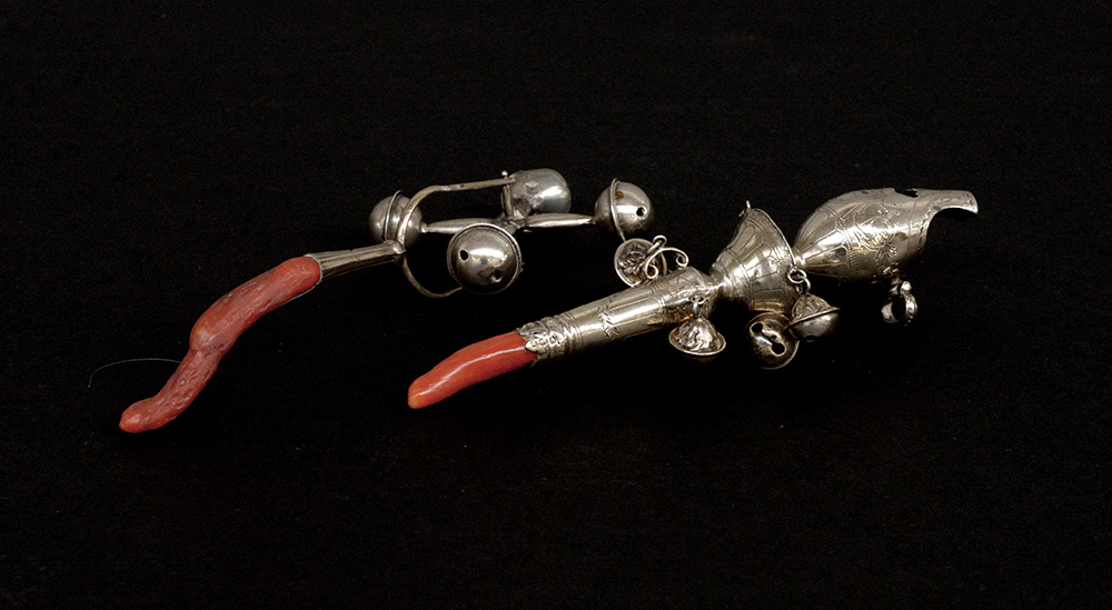 Due sonagli per bambini in argento, uno con fischietto ed uno con campanelli girevoli. Prese in corallo. Secolo XIX/XX (difetti)