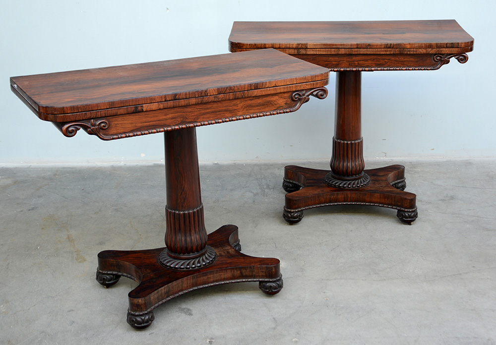 Coppia di tavoli da gioco inglesi, con piano apribile a libro. Sostegno centrale a colonna, base quadrilobata a sagoma. Piedini muniti di rotelle, secolo XIX (cm 90x76x45)