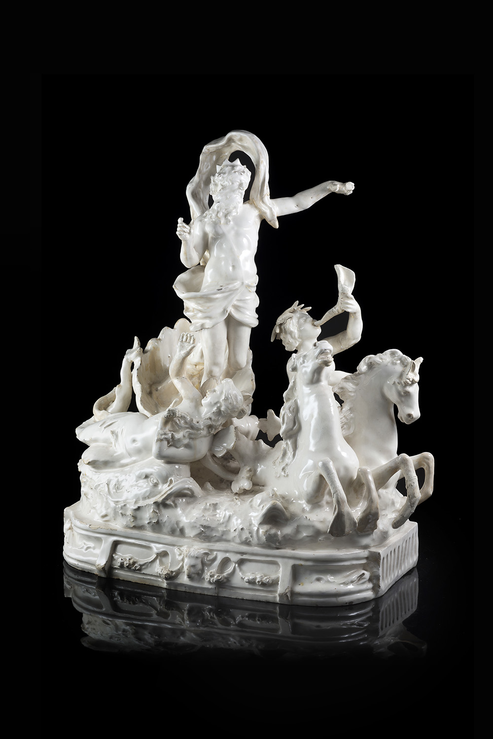 Manifattura veneta, secolo XIX "Carro di Nettuno" gruppo in terraglia smaltata (h. cm 52) (difetti e restauri)