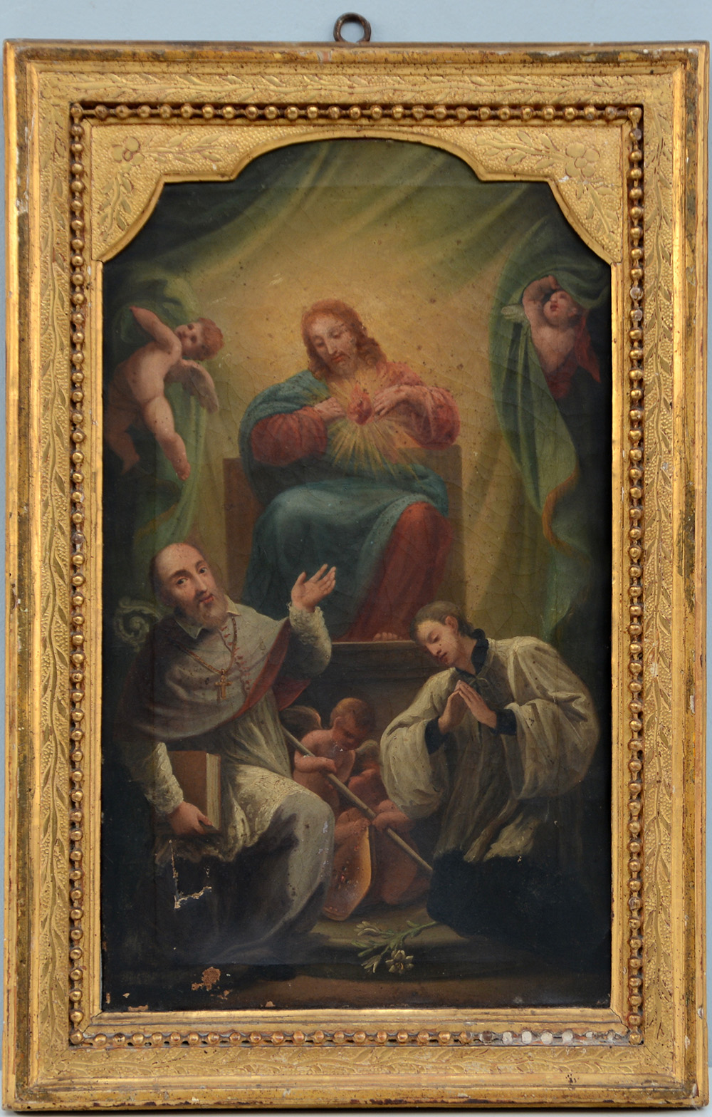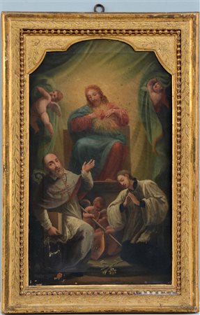Scuola della fine del secolo XVIII "Cristo in trono con santi" Olio su tela (cm 48,5x28,5) In cornice coeva in legno dorato e bulinato (difetti)