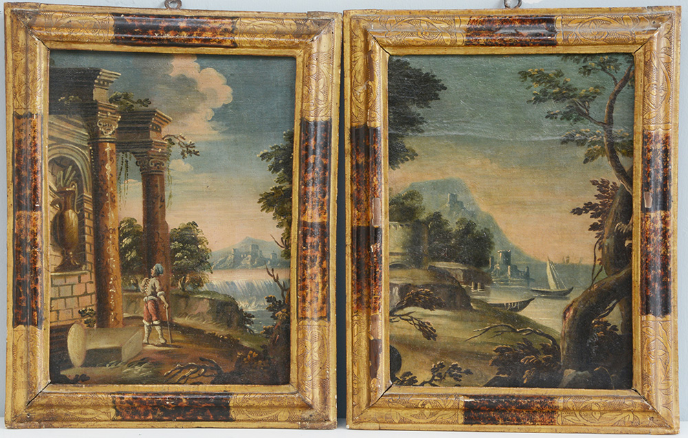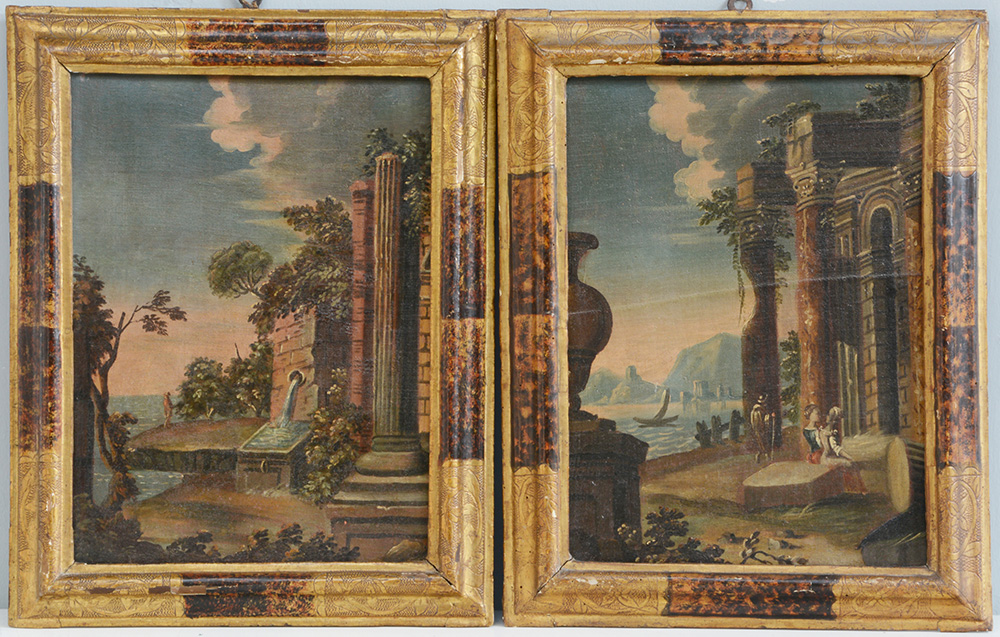 Ignoto del secolo XVIII "Paesaggi con rovine e figure" gruppo di quattro dipinti a olio su tela (cm 45x34) In cornici del secolo XVIII in legno laccato e dorato (difetti e mancanze)