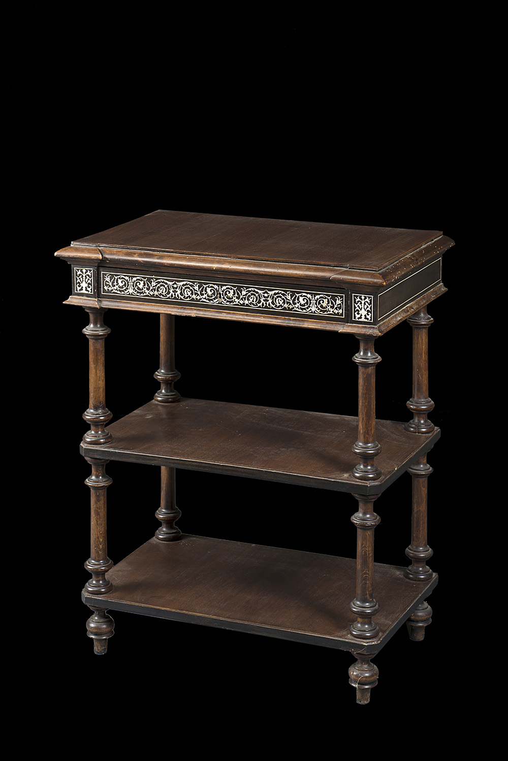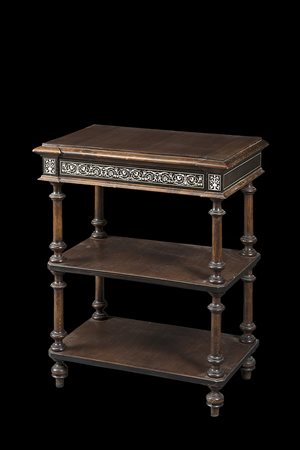 Etagère a tre ripiani in mogano ad un cassetto nella fascia ebanizzata intarsiata in avorio a mascheroni e volute. Montanti e piedi torniti. Ferdinando Pogliani, Milano, secolo XIX. Timbro a fuoco nel cassetto (cm 70x86x44) (difetti)